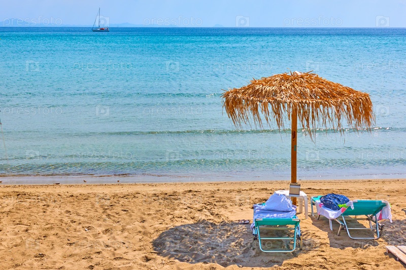 Пляж с палубными стульями и соломенным зонтиком у моря