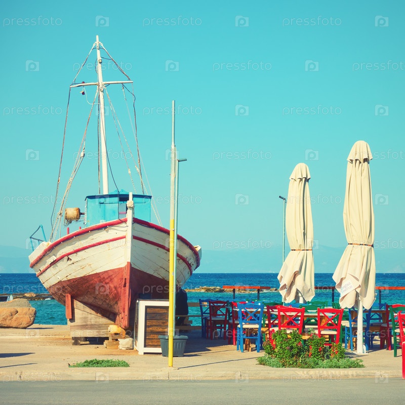 Старая рыбацкая лодка и уличное кафе