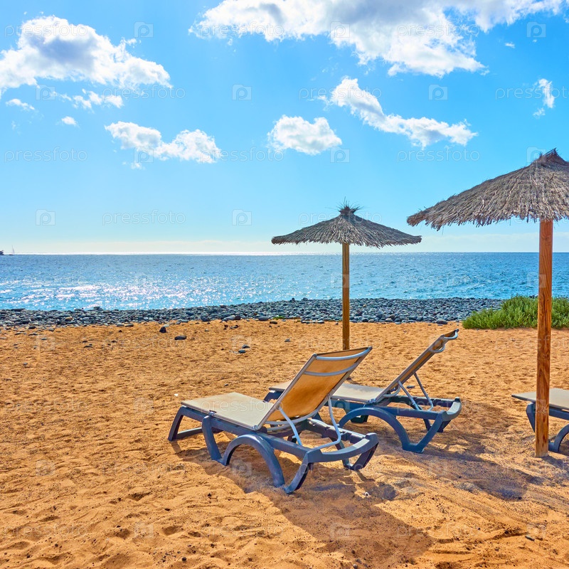 Пляж с зонтиком и шезлонгами