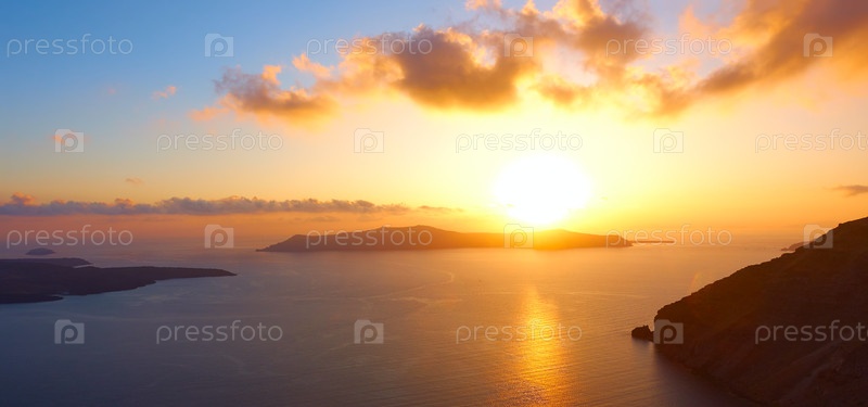 Панорамный вид на закат над морем на Санторини