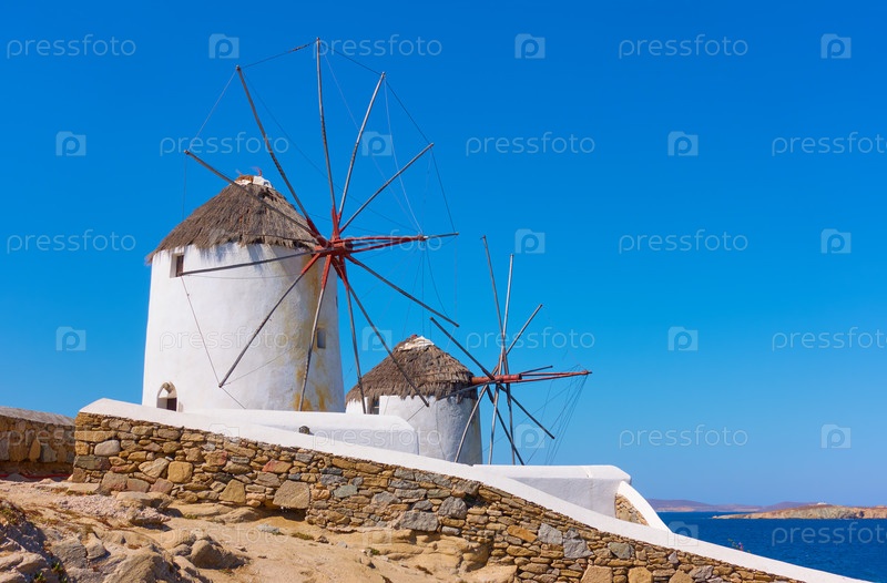 Старые ветряные мельницы на острове Миконос в Греции