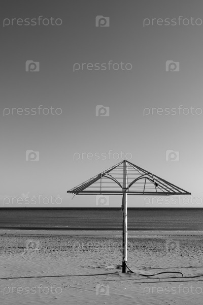 Морской пляж со старым зонтиком в межсезонье