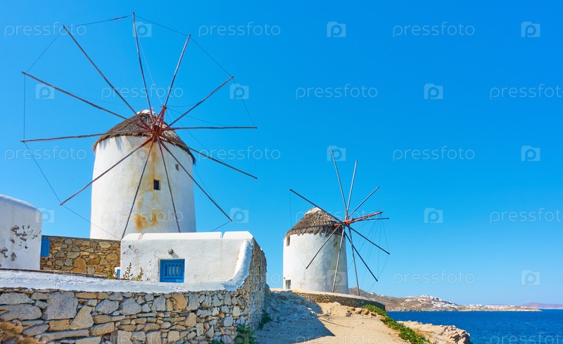 Старые белые ветряные мельницы у моря в Миконосе