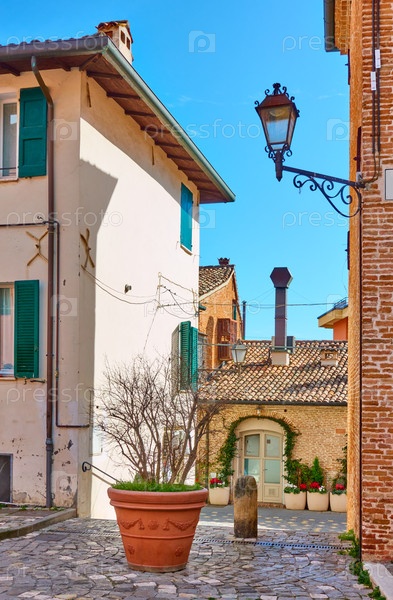Старая улица с большим цветочным горшком в Сантарканджело ди Романья