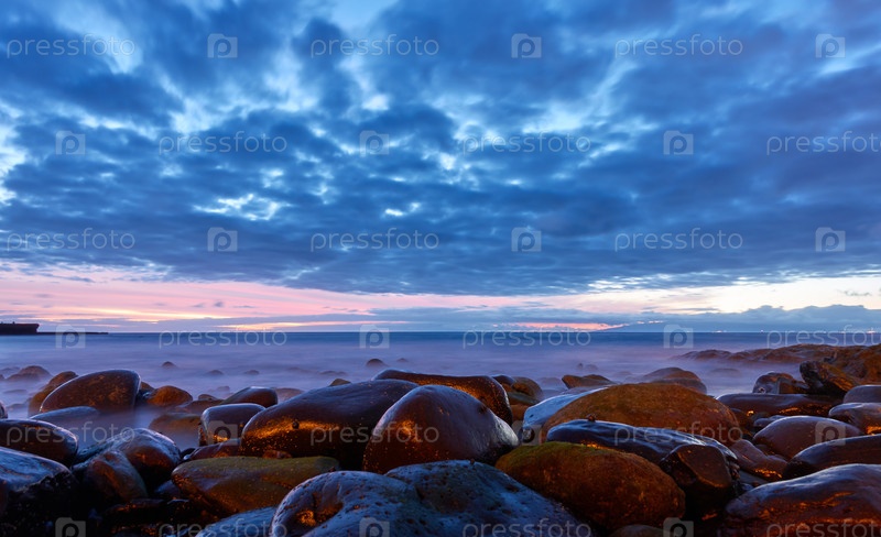 Море после захода солнца и пляж с большими камнями