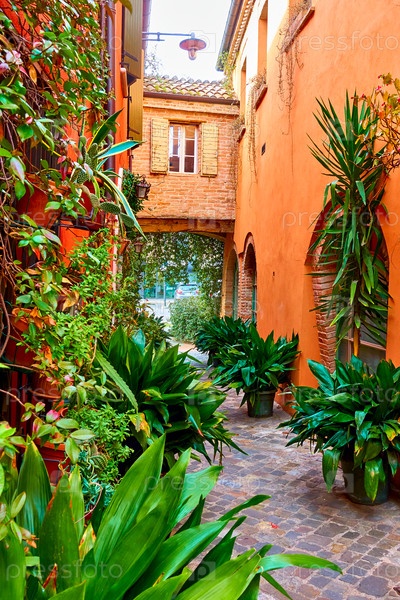 Маленький сад с растениями в цветочных горшках в узкой аллее