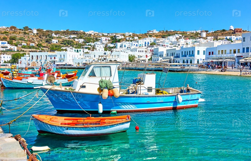 Старый порт с рыбацкими лодками в Миконосе