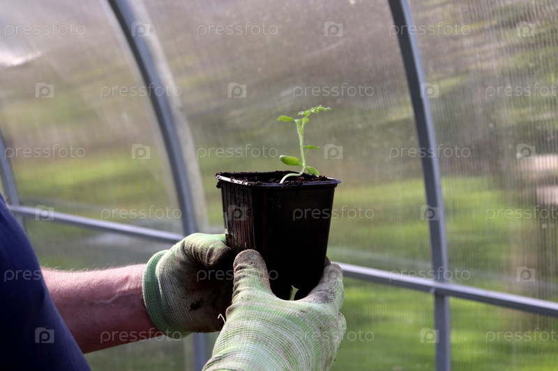 Пожилой фермер держит пластиковый стакан с ростками арбуза в руках, рассада в теплице