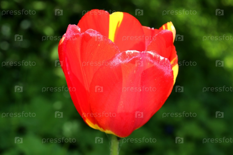 Красный тюльпан с желтыми полосками на лепестках в пасмурный весенний день в саду