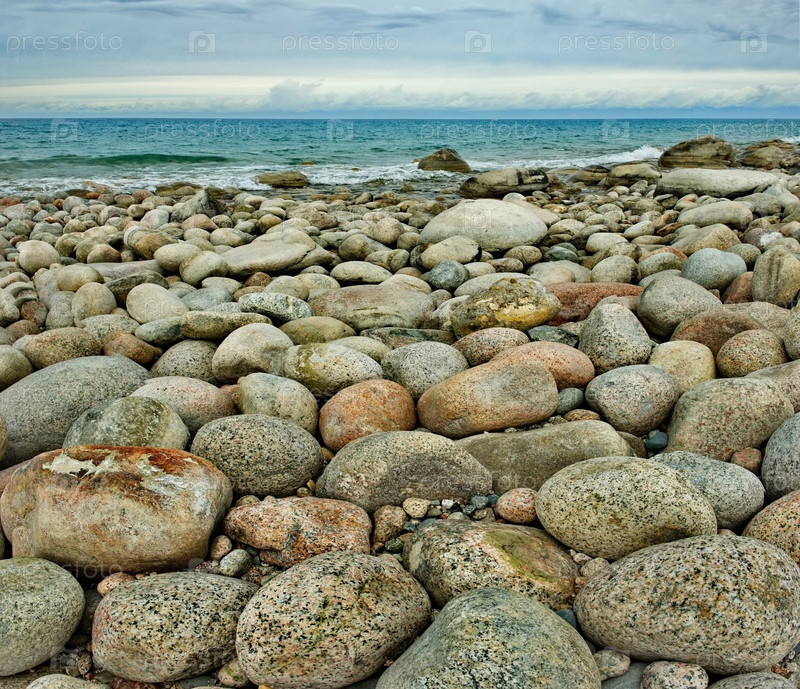 Северный Кыргызстан. Пейзаж холодного озера Иссык-Куль с разноцветными круглыми камнями разного размера вдоль живописного берега