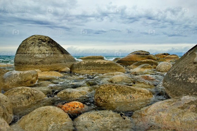 Северный Кыргызстан. Пейзаж холодного озера Иссык-Куль с разноцветными круглыми камнями разного размера вдоль живописного берега