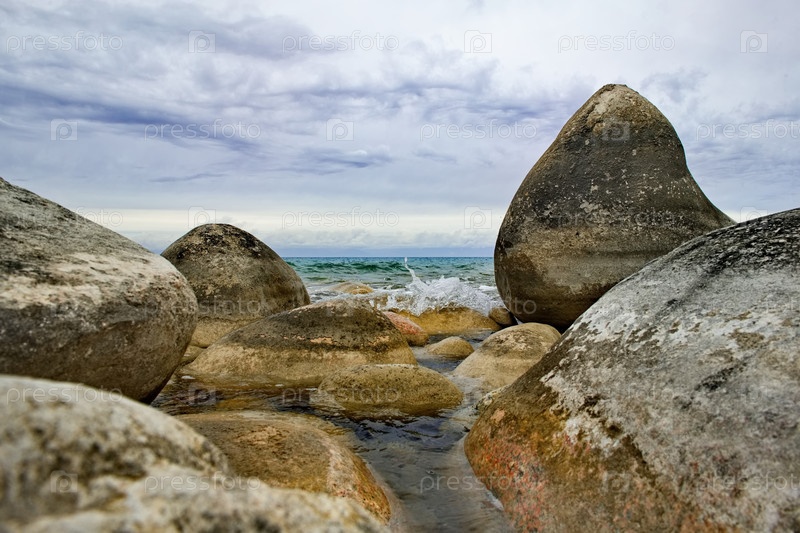 Северный Кыргызстан. Пейзаж холодного озера Иссык-Куль с разноцветными круглыми камнями разного размера вдоль живописного берега