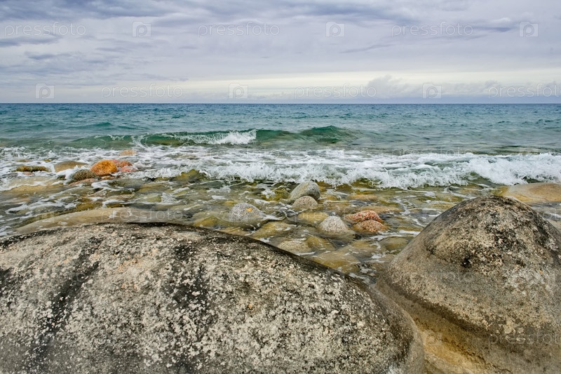 Северный Кыргызстан. Пейзаж холодного озера Иссык-Куль с разноцветными круглыми камнями разного размера вдоль живописного берега