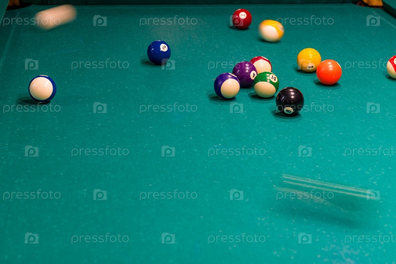 Спортивная игра в бильярд на зеленой ткани. Многоцветные бильярдные шары с цифрами на бильярдном столе
