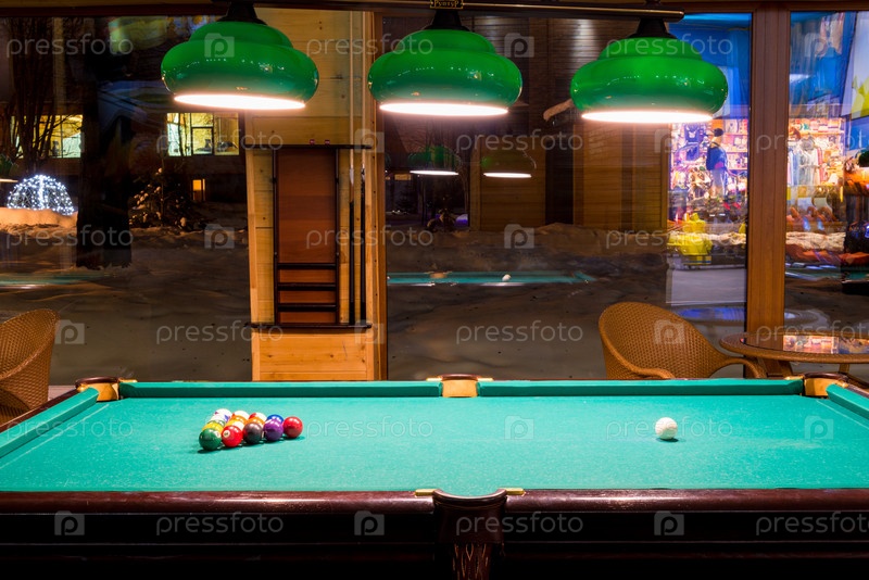 Спортивная игра в бильярд на зеленой ткани. Многоцветные бильярдные шары с цифрами на бильярдном столе