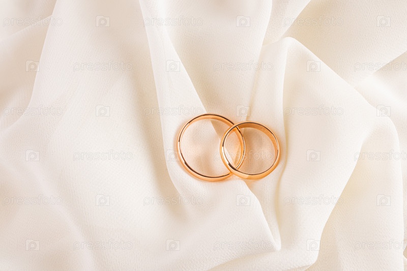 Два золотых обручальных кольца лежат на мягких складках кремового цвета атласной ткани. Вид сверху. Планировка для дизайна. Презентация ювелирного изделия
