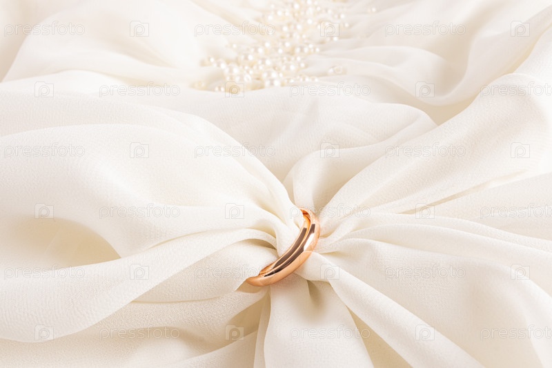 Шикарная мягкая ткань нежного кремового цвета внутри двух золотых обручальных колец. Свадебная композиция. Вид спереди. Копия пространства. макет для дизайна