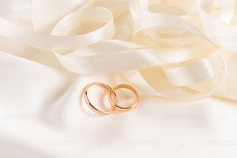 Два золотых обручальных кольца лежат на атласной ткани с красивыми кремовыми лентами. Вид спереди. Свадебный макет для дизайна карт, приглашение