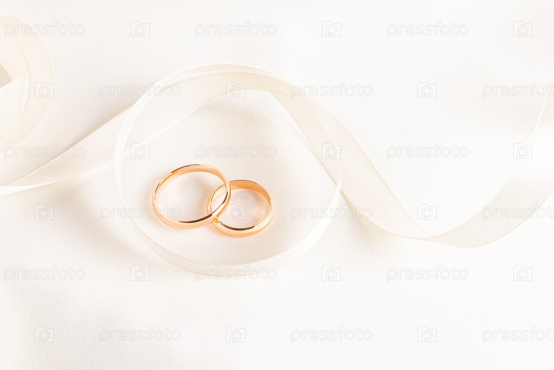 Два золотых обручальных кольца лежат внутри красиво скрученной бежевой ленты на атласном фоне. Вид сверху. Копирование пространства. Презентация обручальных колец