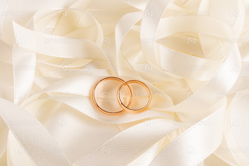 Вид на два золотых обручальных кольца, лежащих на бежевой куче атласных лент. Копия пространства. Свадебный макет для оформления открытки, приглашение