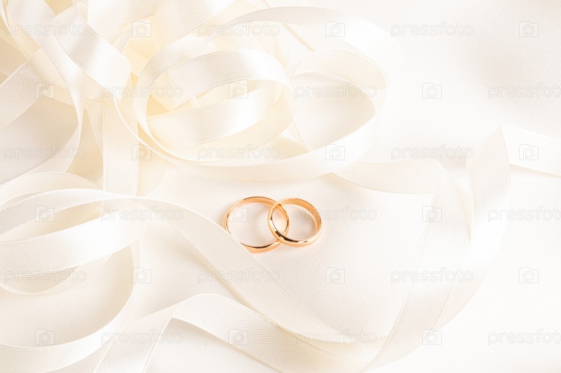 Два золотых классических обручальных кольца лежат среди красивых бежевых лент на атласном фоне. Копия пространства. Шикарный дизайн свадьбы