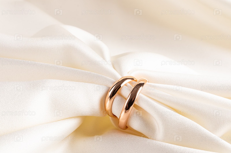 Два золотых классических обручальных кольца нанизаны на шикарную бежевую ткань. мягкие складки атласной ткани. Вид спереди. макет для дизайна, реклама продукта