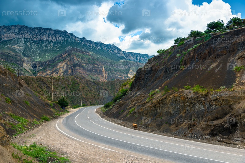 Извилистая асфальтовая дорога в горах Северного Кавказа Дагестана. Россия