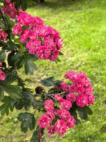 Цветущие розовые цветы боярышника в весеннем саду