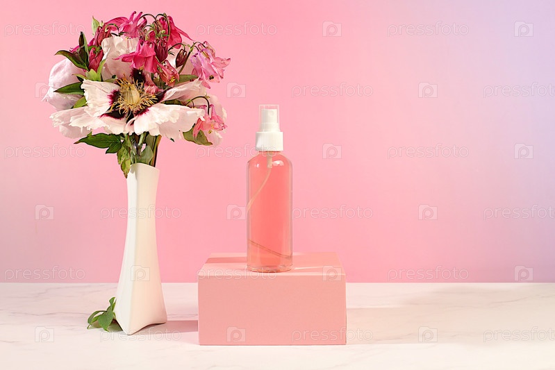 Оздоровительная композиция с розовой водой, свежие цветы горного пиона и колумбина, рекламная карта спа-салона, концепция естественного самообслуживания и здорового образа жизни, абстрактная композиция с цветами