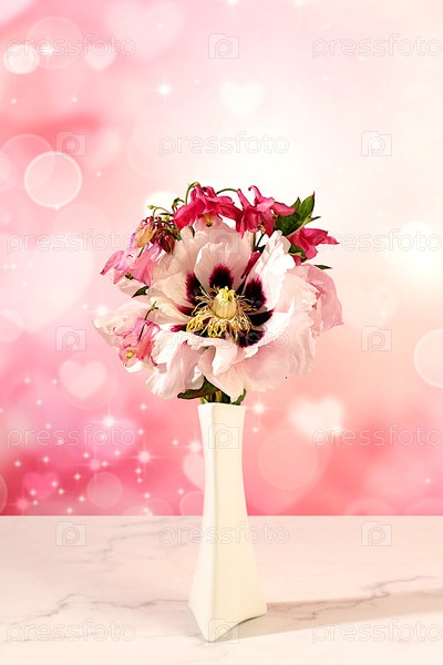 Абстрактная цветочная композиция. Натюрморт с весенними цветами горный пион и колумбин в вазе на элегантном современном столе, шаблон для вашего дизайна с пространством для текста, минимальная концепция красоты, красивая цветочная карта,