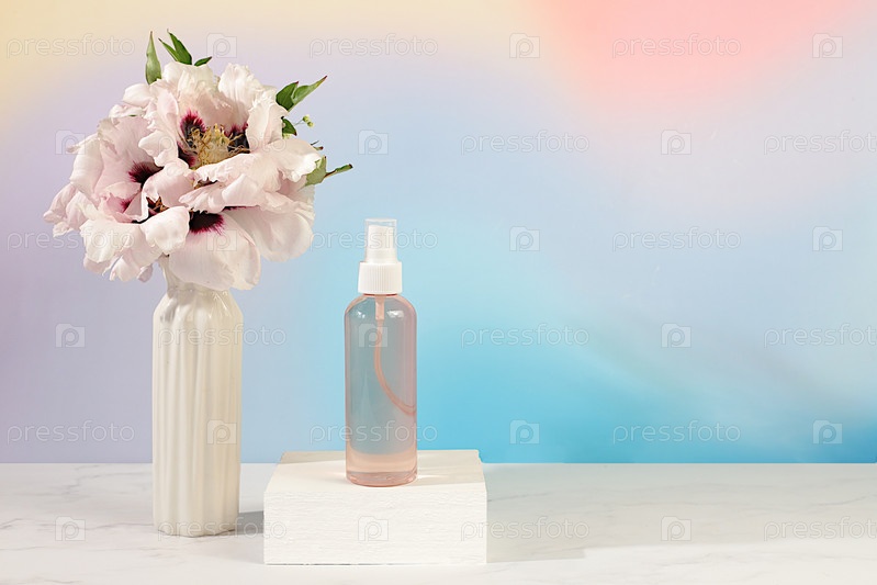 Рекламная карта спа-салона, оздоровительная композиция с розовой водой, свежие цветы горного пиона и колумбина, концепция естественного самообслуживания и здорового образа жизни, абстрактная композиция с цветами