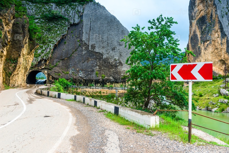 Поверните указатель направления на горной асфальтированной дороге на фоне тоннеля в скалистой горе. Знак направления северного поворота на горной асфальтовой дороге на фоне тоннеля в скалистой горе. Северный Кавказ