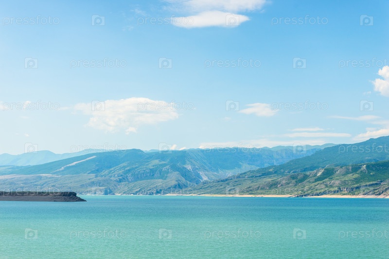 Красивый ландшафт горного Чиркейского водохранилища с лазурной водой Северного Кавказа Дагестана. Россия