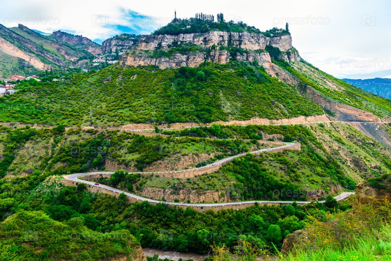 Драматический вид на скалистую зеленую гору со змеиной дорогой. Северный Кавказ