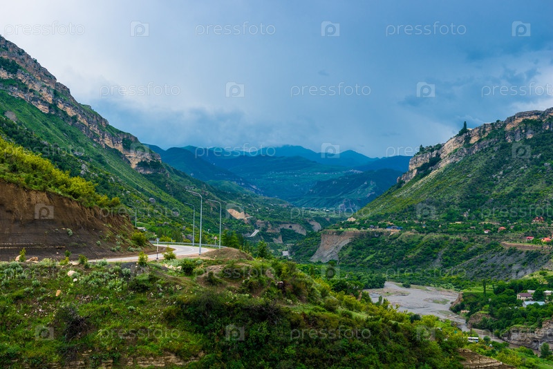 Драматический пейзаж долины горной реки среди красивых скалистых гор Северного Кавказа Дагестана. Россия