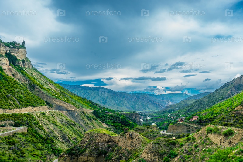Драматический пейзаж живописной долины горной реки в предштормовую погоду на Дагестанском нагорье. Северный Кавказ. Россия