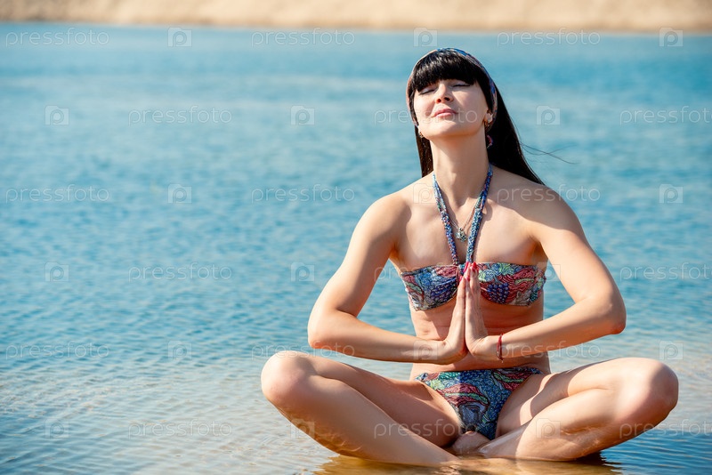Красивая стройная брюнетка в купальнике любит сидеть в позе лотоса на песчаном берегу водоема в солнечную погоду