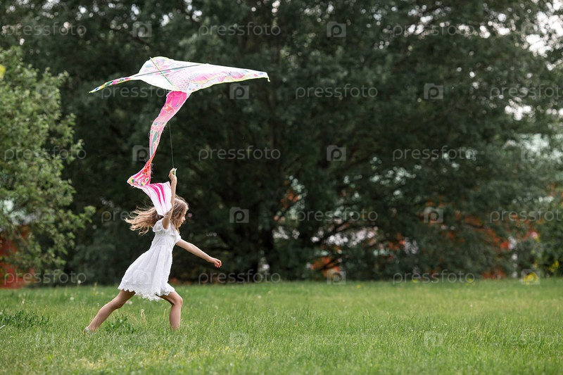 Дети в летнем парке. Красивая девушка летает на воздушном змее. Теплые семейные моменты или концептуальный образ для проведения времени на открытом воздухе