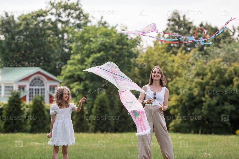 Дети в летнем парке. Красивая девушка и ее мать летают на воздушном змее. Теплые семейные моменты или концептуальный образ для проведения времени на открытом воздухе