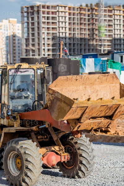 Трактор на строительной площадке крупным планом. Тяжелая техника для строительства и ландшафтного дизайна