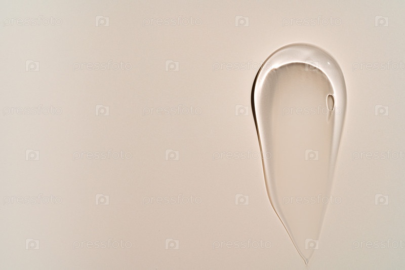 Чистый прозрачный косметический гель мазок на бежевом фоне, уход за кожей глицериновая текстура. Вид сверху. Пространство для текста