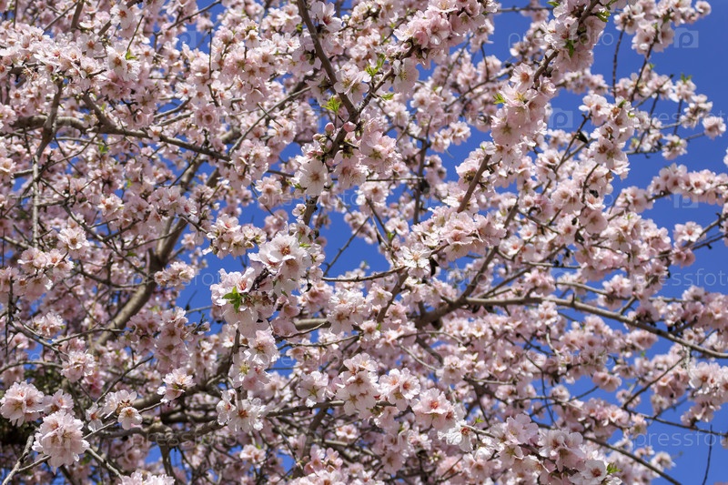 Ветки цветущего нежно розового миндального дерева на фоне голубого неба