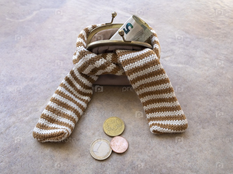Старый кошелек в зимнем шарфе с банкнотой внутри и монетами снаружи