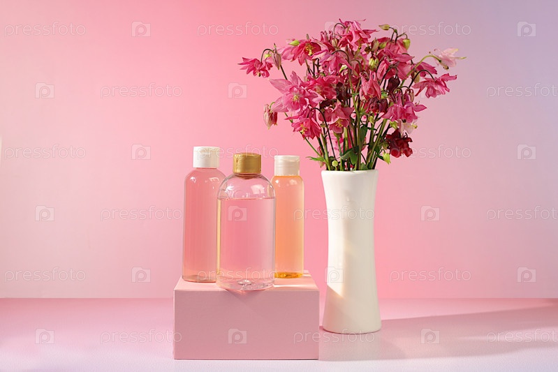 Оздоровительная композиция с розовой водой и свежими цветами колумбина и аквилегии, рекламная карта спа-салона, концепция естественного самообслуживания и здорового образа жизни, абстрактная композиция с цветами