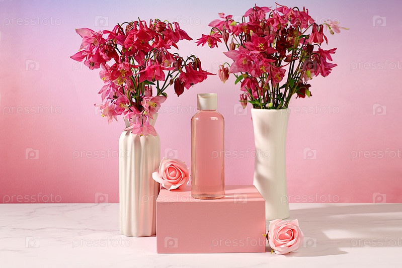 Оздоровительная композиция с розовой водой и свежими цветами колумбина и аквилегии, рекламная карта спа-салона, концепция естественного самообслуживания и здорового образа жизни, абстрактная композиция с цветами