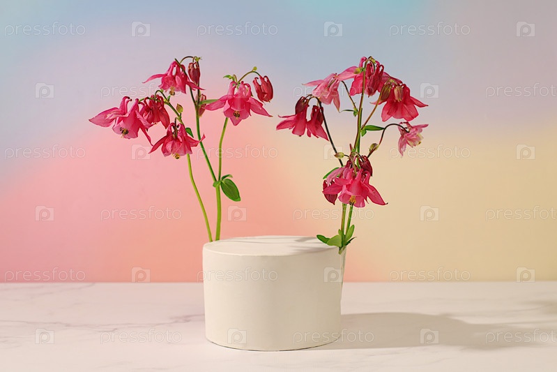 Красивый весенний цветущий колумбин на солнечном фоне, баннер, Абстрактная цветочная аранжировка с пустым подиумом для показа продукта, шаблон для показа, натюрморт с пространством для текста, рекламный флаер