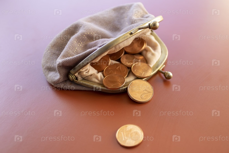 Открытый потрепанный кошелек с мелкими монетами внутри и снаружи