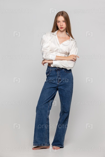 Молодая девушка в джинсах и белой рубашке на сером фоне