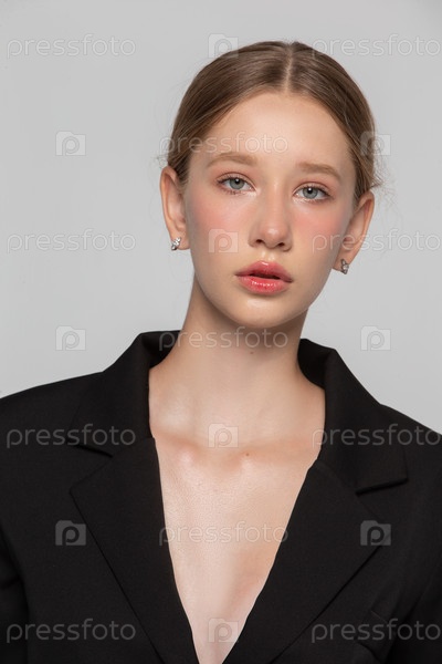 Портрет молодой голубоглазой блондинки на сером фоне. Девушка семнадцати лет