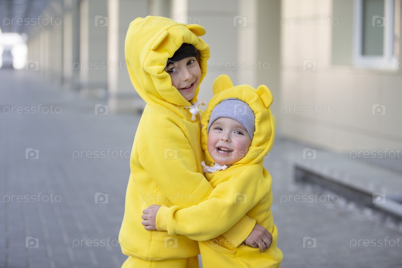 Маленький брат и сестра. Смешные дети мальчик и девочка в желтых костюмах обнимают друг друга